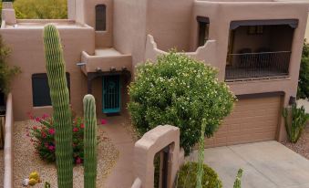 The front yard has two giant saguaro cacti, huge aloe vera plants and a beautiful bougainvillea.