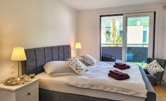 Caslano 12 km from Lugano: Modern, comfortable residence " App. Julia Caslano", 272 m a.s.l.. In the resort 950 m from the centre of Piazza Lago Caslano, in a central, quiet position in the residential district, traffic calmed area, 800 m from the lake, west facing position. Motor access to the house. Roofed, parking at the house. Shop 500 m, restaurant 400 m, bar, bakery 500 m, 7 minute walk to the centre, bus stop "Ponte Tresa" 1.5 km, railway station "Stazione Caslano" 550 m, sandy beach "Lido di Caslano" 1.2 km, bathing lake "Lago di Lugano / Caslano" 1.2 km. Golf course (18 hole) 1.4 km, tennis 300 m, minigolf 1.5 km, cycle lane 100 m, fishing possibilities 300 m. Nearby attractions: Monte Lema 8.6 km, Mercato Ponte Tresa Italien (Sa) 2.5 km, Schokoladenfabrik 700 m, Zoo Magliaso 1.5 km. Well-known lakes can easily be reached: Lago di Lugano 1.1 km, Bootsverleih 1 km, Lago Maggiore 13 km. Hiking paths: Malcantone Novaggio 6.3 km. Please note: suitable for seniors. Object suitable for 2 adults. "Julia", 3-room apartment 85 m2 on 1st floor, west facing position. Object suitable for 4 adults + 1 child. Spacious and bright, modern and stylish furnishings: open large living/dining room with 1 sofabed (150 cm, length 240 cm), digital TV, flat screen and radio. Exit to the balcony. 1 double bedroom with 1 double bed (1 x 180 cm, length 200 cm). 1 double bedroom with 1 double bed (1 x 160 cm, length 200 cm). Exit to the balcony. Open kitchen (oven, dishwasher, 4 ceramic glass hob hotplates, toaster, kettle, freezer, grill, electric coffee machine, Capsules for coffee machine (Nespresso) extra, raclette grill, fondue Set (chinoise)). Bath/WC, shower/WC. Underfloor heating. Parquet floors, natural stone floors. Large terrace 22 m2, west facing position. Terrace furniture, barbecue, deck chairs. Side view of the countryside and the resort. Facilities: washing machine, dryer, iron, hair dryer. Internet (WiFi). Parking (roofed) at the house. Please note: non-smokers only, non-smoking house. NL-00007184