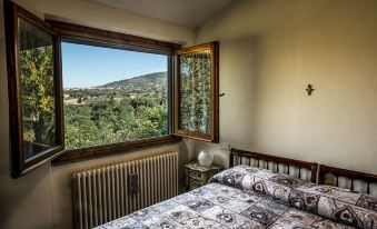 The chalet is finely restored, surrounded by greenery, with a large garden and woods bordering on property, with wide panoramic views over the typical Tuscan landscape. Located on one level (ground floor) with wide slope and easy access to the meadow, it fits perfectly both for children and for people with mobility problems.