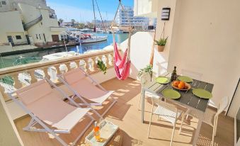 Beautiful T2 rental with 2 large sunny terraces rare in Empuria-Brava feet in the water overlooking 2 different channels (as on a boat!) and on the snowy mountains, one can even fish from the SOUTH EAST orientated terrace. all on foot (beach, restaurants, shops, bars). The scenery of Spain 30min from France. 2 terraces with breathtaking views of the canals in the largest Marina in Europe. Quiet, 2 steps from the beach, shops, many water activities and walks in the heart of nature (several natural parks nearby). possible parking at the foot of the residence. small residence 6 apartments only (1st floor / 2)