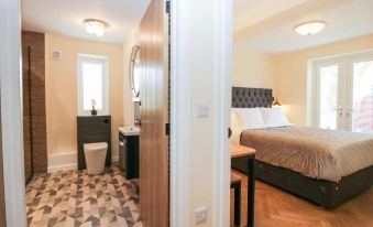 On exiting the living area, the hallway leads to a spacious double bedroom, with king size bed. Patio doors are also present within the bedroom, enabling access to the garden area and providing floor to ceiling views of the surrounding countryside.