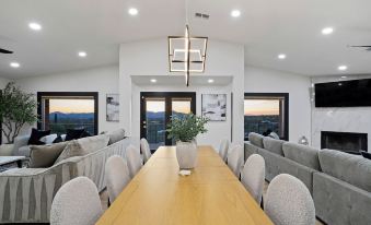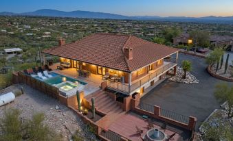 Perched on a serene hilltop in the prestigious Catalina Foothills, this stunning modern home offers breathtaking panoramic views of the surrounding mountains and desert landscape. With sleek architectural lines, expansive windows, and an open-concept design, this residence seamlessly blends indoor and outdoor living. Equipped to accommodate more than 16 guests, this residence is perfect for large families or groups planning a desert escape.