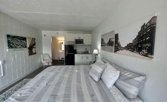This studio unit measures 300 square feet and offers a king bed, full bathroom, kitchenette with apartment size fridge, microwave and quartz countertops!