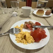 Meksiko Hotel is located adjacent to Ljubljana Central Hospital Emergency Building where including the hospital itself and the parking spots of ambulances. During day time, the sirens made by the emergency vehicles are constant. Luckily it was not the case during sleeping time of our 2-night stay. There’s a Hofer Supermarket right outside of the hotel. The main entrance of the hotel is quite hidden but there are big signs with arrows showing how to access the hotel from the main road and thus we didn’t have any issue to find its entrance. The breakfast room has enough seats for the morning crowds. However it could be quite tough to go through the isles between rows of tables/seats. Breakfast was decent normal continental foods with choices of coffee, juices, and tea