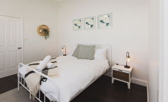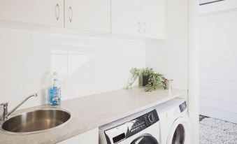Halcyon days has 4 spacious bedrooms with high ceilings. 3 bedrooms have queen beds and 1 bedroom is set up with a bunk bed. The main bedroom is completed with ensuite and walk in robe, the main bathroom is located off the kitchen. A complete laundry is available with washing machine, dryer and ironing board.