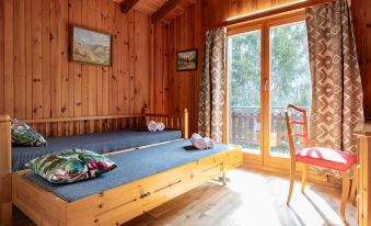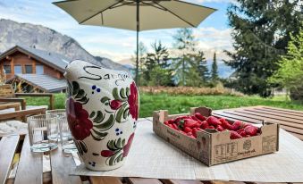 Mayens de Chamoson 4 km from Ovronnaz: Cosy, rustic, comfortable chalet "Le Katanga", 2 storeys. In the district of Berze, traffic calmed area, 4 km from the skiing area. Private: garden with lawn. In the house: central heating system. Motor access (150 m via unmade road). In Winter: please take snow chains, 4x4 car recommended in winter. Parking (for 2 cars). Grocery 3.8 km, restaurant 2.8 km, bakery 3.8 km, bus stop "Berze" 190 m, railway station "Riddes" 9.6 km, thermal baths "Les Bains d'Ovronnaz" 4.5 km. Chair lift 4 km, ski rental 3.7 km, ski bus stop 800 m, ski school 3.7 km, sled run 3.8 km. Please note: car recommended. Suitable for families. The owner does not accept any youth groups. Ski bus (free of charge). "Chalet Le Katanga", 4-room chalet 102 m2 on 2 levels. Partly renovated in 2025, comfortable and beautiful furnishings: entrance hall with separate WC. Living/dining room with open-hearth fireplace, cable TV, hi-fi system and forced-air heating. Exit to the terrace, south facing position. Open kitchen (oven, dishwasher, 4 ceramic glass hob hotplates, toaster, kettle, electric coffee machine, Capsules for coffee machine (Nespresso) extra, raclette grill, fondue Set (cheese)). Exit to the terrace, south-west facing position. Upper floor: 1 children's room with 1 x 2 bunk beds (80 cm, length 190 cm), heating stove. 1 room with 2 beds (90 cm, length 190 cm), heating stove. Exit to the balcony, south facing position. 1 room with 1 pull-out bed (2 pers. 2 x 80 cm, length 190 cm), heating stove. Exit to the balcony, south facing position. Bath/WC. Electric heating. Parquet floors, carpet. Large terrace, south facing position, large, lawn. Terrace furniture, barbecue, deck chairs (2). Beautiful panoramic view of the mountains. Facilities: children's high chair, baby cot for up to 3 year olds, hair dryer. Internet (WiFi, free). Parking (2 cars) at 20 m. Please note: suitable for families. Non-smokers only.