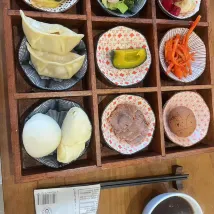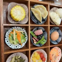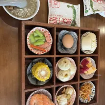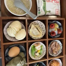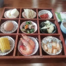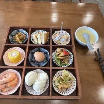 Номер был просторным и уютным, кровать и подушки – удобными. Единственным небольшим недостатком была звукоизоляция. Я сплю чутко, и около полуночи наверху долго раздавались странные звуки – мебель переставляли. Хозяин любезно поменял мне номер на следующий день. Завтрак – их фирменное блюдо, представленное в очень стильной девятисекционной форме! В него также входили пакет молока и миска горячей пшенной каши.