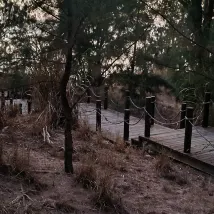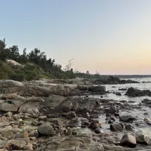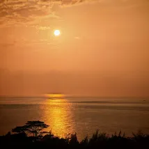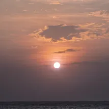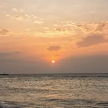 Пляж перед отелем находится примерно в восьми минутах ходьбы по настилу, что немного далековато. На пляже много гальки, собирать камешки было весело, и мне посчастливилось увидеть очень красивый закат.
