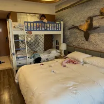 Я останавливался в слишком многих отелях тематических парков и даже посетил тематический отель Wuhu Squirrel Town накануне, но я не ожидал, что Dragon Dream меня так разочарует. Менее чем в километре от «Счастливого мира» начались заторы (позже мы узнали, что охрана отеля перекрыла дорогу, пропуская только гостей отеля). Навигация подсказала нам свернуть к въезду на парковку за отелем, и мы увидели въезжающую машину. Я сказала охраннику, что мы остановились в этом отеле. На улице была огромная пробка. Они любезно разрешили нам спуститься в подземный гараж. Нам сказали. выстроились в очередь впереди и продолжили вставать в пробку. Простояв в очереди 40 минут, мы вошли в отель, а парковочных мест было очень мало. Долго его искали. Вестибюль очень большой, но указатели очень неясные. Даже где зарегистрироваться, надо спрашивать по ходу дела. Девушка, которая регистрировалась, очень непрофессиональна, как я спросила, нанятая на неполный рабочий день сотрудница. ей о билетах и регистрации, а она все время спрашивала. Там было много движения, как будто мне нужно было срочно помочиться. Наконец, я попросил верхний этаж, я спал чутко, и сделал пометку. заранее всего было 28 этажей, и она мне дала 10 этаж. Я сказал переодеться, и она сказала мне найти твою домработницу, а затем ушла. Звукоизоляция в номере плохая. Диван и подушки на детских двухъярусных кроватях в пятнах и очень маленькие. В комнате для родителей и детей тоже есть открытый балкон. При открытии двери есть перила. не следите внимательно за детьми, будет особенно опасно, если они побегут на балкон. На балконе стояли столы и стулья. В общем, со мной было двое детей, и я все время не смела расслабиться. Звукоизоляция была очень плохой, люди разговаривали в коридоре, люди играли музыку по соседству, и самое главное, в первой комнате были люди, которые ели горячую кастрюлю с открытой дверью, и весь запах был в нашей комнате. Цена 1500 за ночь действительно слишком велика, чтобы жаловаться. На следующий день за завтраком им сказали, что и 28-й, и 2-й этаж свободны. Когда я подошел к 28-му этажу, я был ошарашен. Все дело в том, чтобы захватить вещи после того, как они были. схватили. Все были пусты и мест не было. Я ела стоя с тарелкой в руках. Ключевой момент - завтрак не дешевый, он стоит 128 на взрослого и 58 на ребенка. Тогда Водный мир еще более безмолвен. Он не открыт на открытом воздухе, а внутри очень маленький и открыт только наполовину. В этом нет необходимости. Ключ в том, что не все дополнительные платные предметы включены в билет. Первомайский билет тоже сильно увеличился. Вероятно, я больше туда не пойду. Управление хаотичное, и такое ощущение, что у него просто плохая репутация. Я долго этого ждал и был очень разочарован.