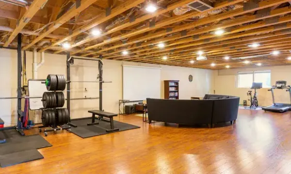 Open spaces with amazing lake views from both owner’s suites, main level living room and basement living room. The basement has two main spaces, a finished living room with a fireplace, 55” 4K TV, game table… and a partially finished recreation room that is just over 1,000 sq ft with amazing gym equipment, a two-person sauna, and a large sectional to watch movies on the 98” projection screen.