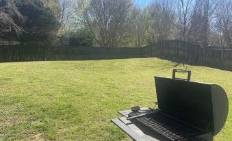 Outside is a large fenced back yard with patio and charcoal grill