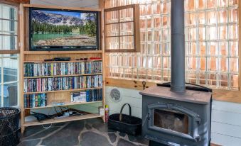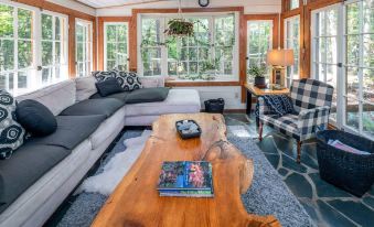 Our photographer described this place as "Cozy and super charming. Lots of windows and great art make it feel warm and inviting." There are more windows in this house than in most houses three times the size. Handmade feel with many artsy touches like original mosaics, wood and slate floors. A wood stove for experienced fire tenders on cold days and evenings. This is a one of a kind place that is unique and hard to find.NOTE: It has a very outdoorsy feel. You're likely to see squirrels, birds, maybe even a fox or raccoon. Summertimes are usually full of bugs — and they might find themselves inside your home. Cobwebs can appear literally overnight. For those weary of the great outdoors or nature's creatures, this place is not for you. We do not fumigate and choose to use natural pest management strategies whenever possible. The home is chemical and fragrance-free for easier breathing and better sleep.