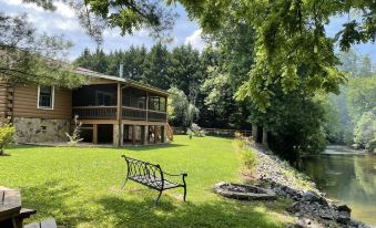 Let the river soothe your cares away while staying in this beautiful River side home. Bring your fishing pole to catch Carolina trout from Valley River by day & enjoy the fire pit at night. Minutes from Harrah’s Casino & downtown Murphy. This incredible sprawling 3-bedroom log home provides plenty of space for guests and is pet friendly (there is a pet fee). Come relax on the comfy furniture in the den for some family fun! There is a huge kitchen with plenty of eat in space as well as a dining room for guests. The open concept family room has a large sectional and seating for TV viewing or relaxing by the wood burning stove. The screened in porch looks out over the rushing river that runs along the back yard. Pamper yourself in the cozy primary bedroom with queen bed and En suite bath with walk in shower. The peaceful second bedroom has a queen bed and it's own private deck and seating. Kids will love the Third bedroom with 2 sets of bunk beds. Please enjoy the grounds but please use caution near the river.About pets:Pets allowed: dogs (limit 2 total).Allowed on case by case basis.About checkOut:Check out before 10:00 AM.About children:Children allowed: ages 0-17.About customRules:Please be careful around the river. It is deep and has a fast current at times. No swimming permitted in the river. Fishing is recommended.75.00 pet fee. No pets on furniture. pets must be crated if left alone. If it is determined that pets have caused any damage, there is a 200 fee..About checkIn:Check in after 4:00 PM.About smoking:Smoking is not permitted.About minBookingAge:Minimum age to rent: 25.About events:No events allowed.