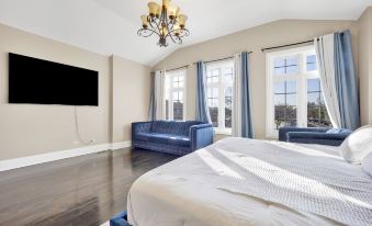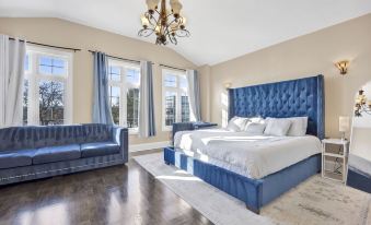 This spacious 4 bedroom 3 1/2 bathroom property, featuring high ceilings on each floor, including the basement, comfortably sleeps 8 adults. The master en suite features south facing windows for natural sunlight and a spacious walk-in closet, with a designer bathroom. Throughout the house, are ultra modern design elements like the custom ceiling to floor stone wall paneling with digital fireplace, hardwood flooring, and intricate ceiling designs.