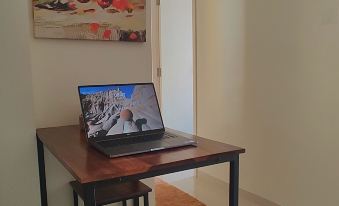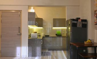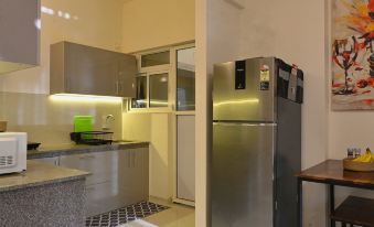 Whether you want to rustle up a quick breakfast or cook some comfort food, the kitchenette comes equipped with an induction stove, microwave, toaster, kettle, refrigerator, and all the cutlery and crockery you require. There is also a 2-seater dining area that doubles as a workspace.
