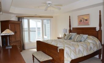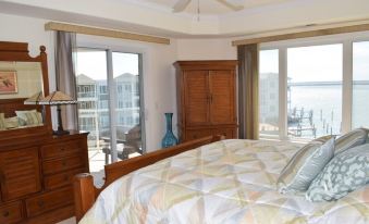 The master bedroom enjoys waterfront views and shares deck access with the living room.