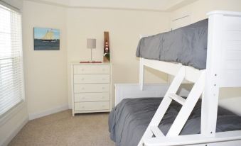 The queen bedroom and pyramid bunk bedroom share adjoining hall bath.
