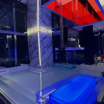 Дизайн номера сочетает в себе технологичность и искусство: интеллектуальная система управления, панорамная ванна и бар с видом на облака.
