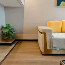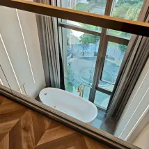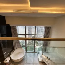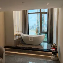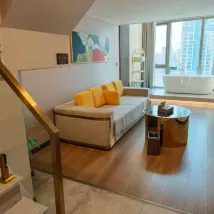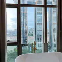 Прямо при входе — огромное панорамное окно, рядом с которым стоит ванна, а за окном открывается вид на Raffles City и реку. За такую цену в этом районе это просто невероятное соотношение цены и качества! Двухуровневый номер: спальня наверху, гостиная внизу. На первом этаже огромный диван, на котором могут сидеть 5-6 человек, он действительно большой. Этот номер превзошел все мои ожидания. Если у вас ограниченный бюджет, но вы хотите насладиться прекрасным видом, очень рекомендую этот отель.