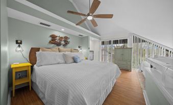 Walking back inside you will find a spiral staircase, which leads to the upstairs accommodations. Here you will find a comfortable king sized bed with night stands on both sides of the bed and an additional twin bed with nightstand. Continuing past the King bed leads to two closets where you'll find fresh linens and robes, and then the full bathroom. The bathroom has a standard walk in shower with glass door. Shampoo, Conditioner and Body Wash are provided.About pets:No pets allowed.About checkOut:Check out before 10:00 AM.About children:Children allowed: ages 0-17.Pack-n-Play Available!.About checkIn:Check in after 4:00 PM.About smoking:Smoking is not permitted.About minBookingAge:Minimum age to rent: 21.About events:No events allowed.