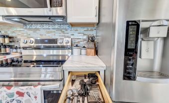 Photo booth at the entrance. As you step inside, you'll be greeted by a spacious living area, cozy bedrooms, fully equipped kitchen and our backyard boasts a sparkling pool.