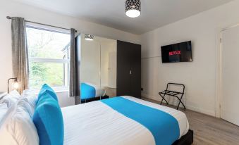 The spacious and stylish lounge boasts 10ft high ceilings comprising of a large comfortable corner sofa / fold out bed with memory foam mattress. Entertain yourself with our 55-inch smart tv, including Netflix, Amazon Prime, YouTube & free view. Make use of the workstation / dining area providing a space for you to use and relax during your stay here at Tettenhall Lodge apartment.