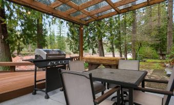 Upon entering you are greeted with a huge open layout including the kitchen, living, and dining room making it an exceptional space for your entire group. There is ample seating for everyone. Without a doubt, you will want to incorporate the outdoor space as well. It is an enormous deck with much of it covered. All of it has incredible wooded views right on the banks of the Sandy River. The hot tub is a hit year round, so don't miss it!