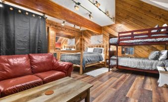 Ascending upstairs you will find three additional sleeping areas and a fantastic nook equipped with two chairs and a beautiful chess set. One of the bedrooms is a wonderfully appointed and spacious private bedroom. The second is a smaller room with a twin bunk bed making it perfect for the younger ones. The final bedroom boasts a king bed and en-suite bathroom as well. Please do note this bedroom is open sound-wise to the family room below. There is an additional private deck here to enjoy.