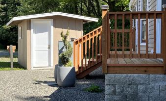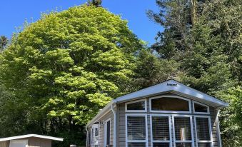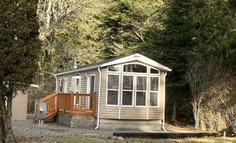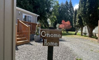 The Gnome Home sleeps two comfortably in the queen size bedroom and two more in the double size sleeper/sofa in the main living area. There is one bathroom with a shower, having a skylight overhead. The small laundry set, a full size refrigerator, propane stove and microwave oven all add to your convenient stay. An electric fireplace provides some cozy ambiance while you relax in the living room and watch basic cable T.V. or find entertainment with WIFI.
