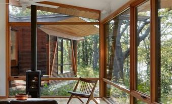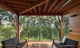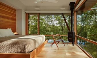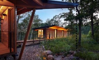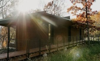 Perched high on a bluff over the hidden lake, LongHouse is the perfect getaway. This one-story, 1,200 sq.ft. cabin has one king bedroom, one queen bedroom, and two bathrooms. Floor to ceiling glass brings the outdoors inside, and each season brings its own unique perspective. Traverse the bridge over a dry creek bed and enjoy water views from a large screen porch. Staying in LongHouse is truly a one-of-a-kind experience.