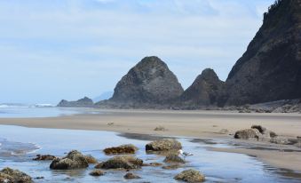 Cove Beach is one of the least-known beaches on the Northern Oregon Coast. Watch pelicans and cormorants from the living room window as they roost on Castle Rock, part of the Oregon Islands National Wildlife Sanctuary. During low tide, a vast sand beach is exposed at Cove Beach. It is common to have the entire two-mile beach to yourself a rare treat not only for Oregon, but for most of the world. During high tide, there is not much sand exposed, but you can drive one mile to Arch Cape Beach where there is always sand. Or, within 6 miles to the south, you can visit Manzanita Beach, a stretch of seven miles of beach.