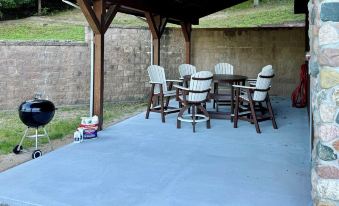 Outside and connected to the house is a lean-to with a table for 6 and charcoal grill with accessories.