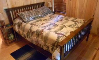 The interior of the cabin is extremely comfortable with a bedroom and bathroom located in the loft. Downstairs bedroom has French doors opening onto the back porch with a wonderful view of the river. Both rooms have queen size beds. The dining area seats four, with room for more, and is open to the living room and TV. The loft above is hidden from view but open to the living room for TV and fireplace action. It’s great for kids that are safe on stairs, it makes a perfect gaming system station, and keeps the living room clutter and cord free. The couch is also a sleeper sofa. A cozy hearth surrounds the fireplace with easy propane logs, it is perfect for cool weather. The living room has French doors that open on to a screened in porch with a fridge/freezer in the corner for fish, and a bug free area for summer nights. It’s a good spot for tackle storage, with a screen door and loop lock separating it from the outside deck. Charcoal grill and extra deck furniture make the covered back porch and deck area perfect for gatherings, large or small, in any weather.