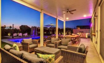 The Chateau is the perfect place to enjoy a weekend of fun with your friends and family. This spacious home sleeps up to 19 people with 7 bedrooms. The backyard is equipped with a brand new pool and spa, plenty of outdoor lounge areas, a putting green, fire pit, and an outdoor shower.