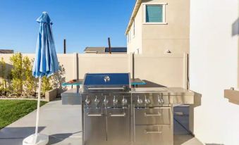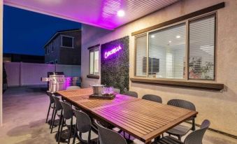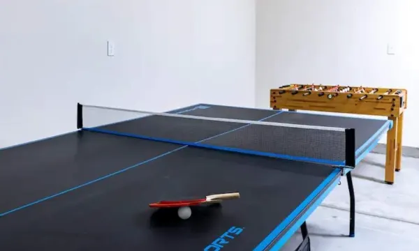 Enjoy a sprawling backyard that is perfect for some fun in the sun. The pool is newly built with a spa, baha ledge, loungers, and umbrella. The covered patio includes an outdoor dining table and outdoor sofas. Behind the pool you’ll find a fire pit to enjoy stargazing at night. The backyard also includes a BBQ, outdoor shower, and lounge chairs for your whole party. If you’re looking for some fun activities, you can enjoy the putting green, foosball, and connect 4.