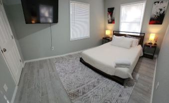 Bedroom 1: 1 (one) King Bed - Comfortable Memory Foam Mattress, Wall Mounted Internet TV, plenty of USB ports on two bedside tables with LED Lamps, Tile Floor with Area Rug, 1 (one) Closet.