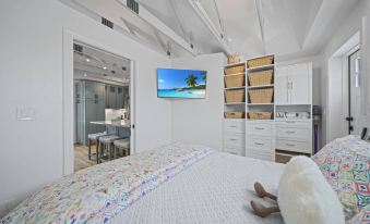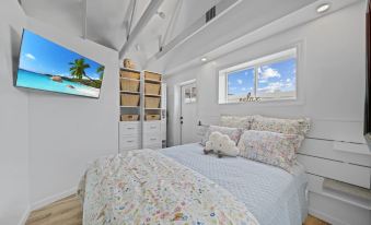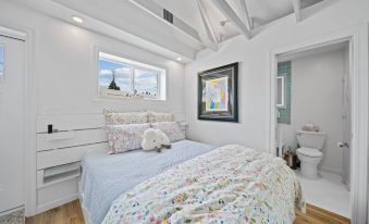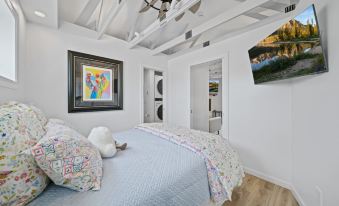 The spacious bedroom features a plush queen-sized bed, ensuring a restful night’s sleep. In the spa-like bathroom, the custom walk-in shower adds a touch of luxury and relaxation to your stay. Plus, with an in-unit washer and dryer, you’ll have all the comforts of home, whether you're here for a weekend escape or an extended stay.