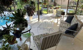 Take it easy at this unique and tranquil getaway. The space is located on 2.6 acres of lush tropical plants. A pool is just outside the door with a hot tub and chairs to lounge on. The space contains a bedroom with a king size bed, full bath, and a sitting room with a kitchenette. It is the perfect place for a couple to spend quiet time, but it is close to shopping and beaches are a short drive away. Naples restaurants are many and excellent.