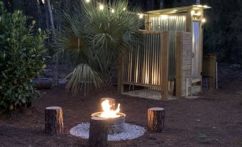 WCC is your private North Naples sanctuary nestled into a beautiful pine grove, a short walk to dining/shopping/music. Your luxurious 168 sqft tent has A/C, a queen bed, fine linens, robes, a hair dryer, and speaker. A kitchenette w/coffee maker, toaster, microwave, fridge/freezer. Adirondack chairs, a gas grill w/burner, a picnic table, a hammock, a fire pit and more. Private outdoor hot shower and flush toilet. Great mood lighting inside & out. 10 miles to beach- chairs, coolers, bikes avail.About pets:No pets allowed.About checkOut:Check out before 11:00 AM.About children:Adults only.About customRules:7 day maximum length of stay.About checkIn:Check in after 3:00 PM.About smoking:Smoking allowed: in designated areas.About minBookingAge:Minimum age to rent: 21.About events:No events allowed.
