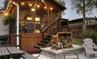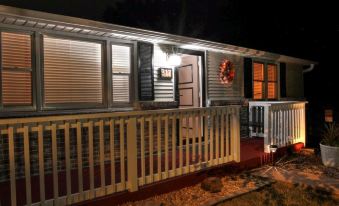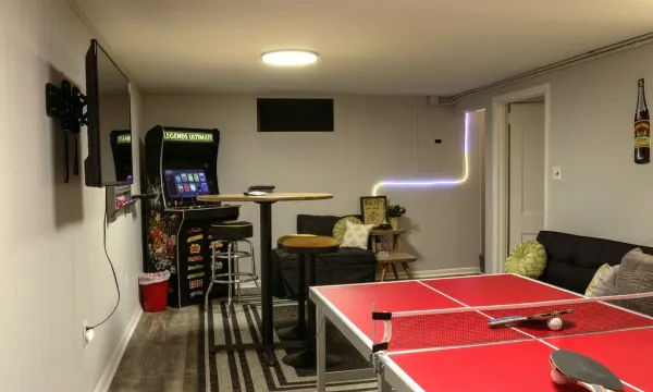 Unique kitchen and living/dining room for 8 guests with a bar/restaurant theme including 2 high top tables and a booth. Downstairs has lounge with ping pong and cabinet video game with hundreds of titles. Out back there’s a screened deck with table and chairs (seats 6). Or try the lower deck with furniture and grill. Or head over to the lighted firepit area which has room for everyone, plus a picnic table.