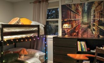 At some point you'll want to sleep. No problem! We have great beds. Two bedrooms upstairs and two downstairs. Up has primary bdrm and kid friendly room with bunks (has a 250# weight limit if you're looking to relive college!). Downstairs has two bdrms and an access door. There's also a futon and ingenious fold out ottoman which puts our capacity at 8. Plenty of parkingAbout pets:No pets allowed.About checkOut:Check out before 11:00 AM.About children:Children allowed: ages 0-17.About customRules:No street parking allowed, or yards, this includes guests and visitors. Any vehicles beyond the driveway will need to be moved. Please communicate it.About checkIn:Check in after 4:00 PM.About smoking:Smoking allowed: in designated areas.About minBookingAge:Minimum age to rent: 25.About events:No events allowed.