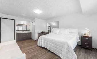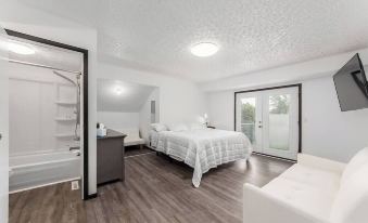 • Living room contains a 75” 4K television and oversized electric fireplace.