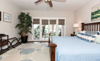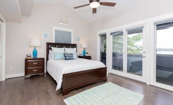 The Master Bedroom is on the first level. It includes a King Size Tempurpedic mattress with luxury linens and anti-allergenic mattress covers and pillows. It includes his and hers walk-in closets and full bathroom with gorgeous new claw foot tub and step in shower with rain shower head--we provide thick bath towels and beach towels. A Smart TV is in the Master--NO CABLE, just streaming available. The room has a floor to ceiling wall of windows to enjoy the lake views as well as french doors that lead out to the balcony. But don't worry about the light--custom black out shades cover the entire wall of windows.