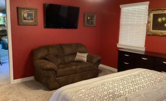 The West Wing at the Manor sleeps up to 6 guests with a full bathroom and kitchenette, plus a small dining table. However, please note the upstairs bedroom has two (2) queen beds with a queen sofa bed downstairs in the living area. Also note, you may request an interior access door between the West Wing and The Manor can be open / unlocked, but done upon request only.
