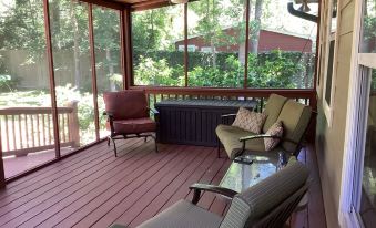 Our main house, The Manor, comfortably sleeps and entertains up to 10 people with a pool table and darts just inside the front door leading to the kitchen area. The Manor also has two master bedrooms (Master 2 is ADA accessible), an open living space and kitchen area, a nice size front porch as well as a screened in back porch for enjoying morning coffee. The pool table also has table-top pieces in front bedroom closet for dining together, if that's your dining preference.