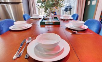 The full kitchen and dining room area comes fully equipped to whip up tasty meals together. In the kitchen you can find all the essentials such as a blender, toaster oven, pots, pans, muffin tins, strainers, cutting boards, measuring cups, plates, cups, wine glasses, utensils, children’s dinnerware, and more. Enjoy dinner inside or outside by the fire! Under the sink you can find the fire extinguisher and two 25 foot dog leashes you can easily clip around the deck posts.