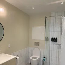 Bathroom can be improved. small shower booth despite having a huge bathroom.