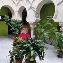 Hôtel -Riad cosy et superbement décoré, un peu à l'écart du centre touristique. Il est ouvert 24/24 et il y a toujours quelqu'un pour vous renseigner à la réception. La rue est très calme et il y a peu d'établissements pour se restaurer à proximité. L'hôtel a un petit garage (12 euros par jour) et il y a un garage municipal à 10mn à pied (16.50€/jour). La circulation dans Cordoue est très difficile et l'accès à l'hôtel est compliqué en voiture. Il est plus sage de laisser sa voiture au parking public et de finir le trajet à pied.