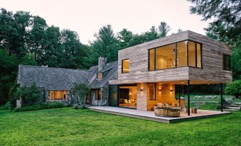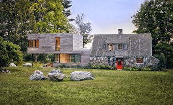 Located in Cornwall, this house is a dream. Owned by 2 architects, it blends the historic old stone cottage with an exciting modern addition. Huge views are open to the south. With 4 bedrooms including 1 king, 2 queen, and 2 twin beds, guests will have plenty of space to unwind. The 3 bathrooms offer a bathtub, shower, and hair dryers for added convenience. The newly renovated garage has an office loft for when you need a quiet place to work. There are 2 wood fireplaces. The cozy den off the kitchen creates a social hub for cooking and playing games. The kitchen is well equipped for any meal. There is a large gas grille of the terrace. The covered terrace has an outdoor seating area, picnic table and 8 person hot tub,