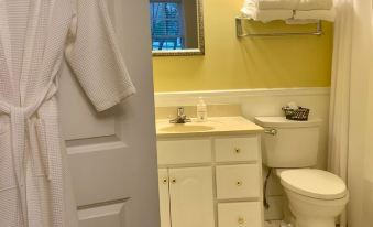 The artistically refurbished Galloway Room features a brand new queen size memory foam mattress and private shower/tub. The room faces east to courtyard & parking lot for access & privacy. It is perfect for those traveling with a dog. Guests have access to a lovely lobby w/ fireplace & coffee/game room.